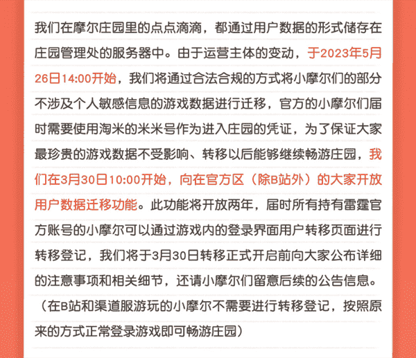 合作结束本就是开发方和代理方双方的事情,,,降低这件事情对玩家的影响,,才是对所有珍视这段童年的摩尔玩家最好的呵护。。目前看来,,,用户完全不用担心后续因无法登录游戏而造成任何数据上的损失,,,,只要及时进行账号转移,,就可以好好保留、、、延续在庄园的痕迹和回忆,,继续在庄园里做快乐的红鼻子小鼹鼠。。